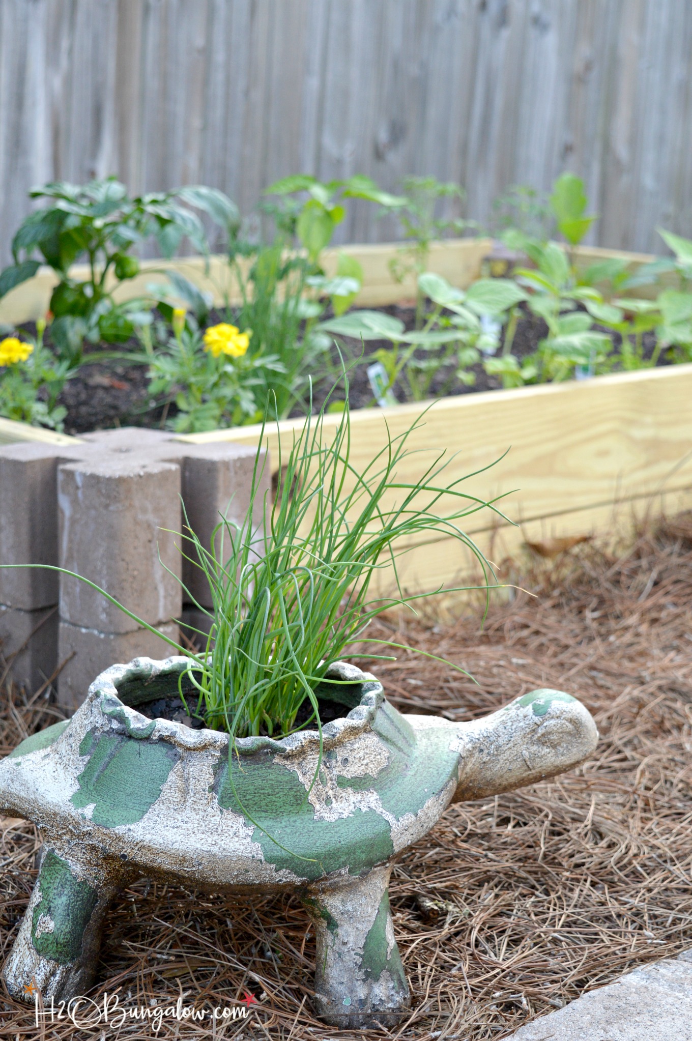 Love the new updates! Pretty spring colors! The walkway looks great, love the blue of the metal table, and the Cute turtle by your raised planter. Pinning!