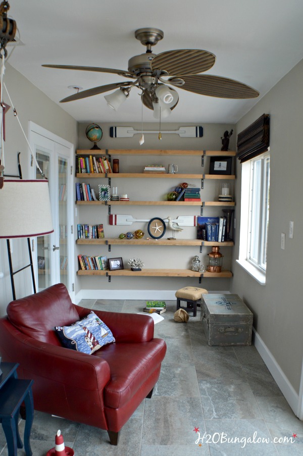 Our reading nook took on a personality of its own once I started putting it together. With its rough cut wood shelves and big cushy masculine chair I was able to find a home for all our nautical decor, some of my husbands travel memorabilia from his days in the Navy and a few other cherished family pieces.