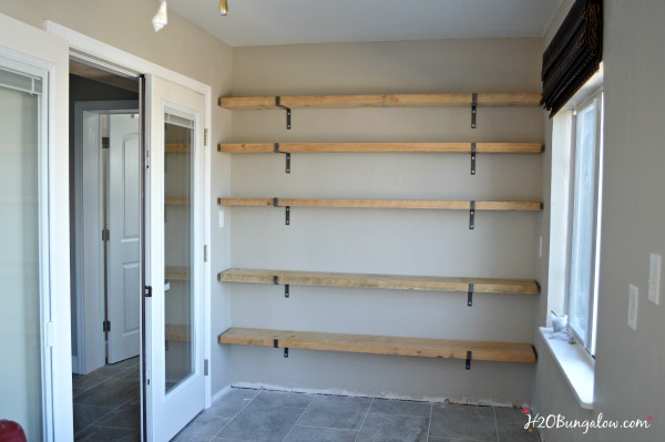 I added DIY Industrial Style Shelves, floor to ceiling on the back wall with rough cut cypress from a local saw mill. Recreating this look is easy, if you don’t have access to a saw mill for rough cut wood, Home Depot carries rough cut cedar boards that look exactly like this.