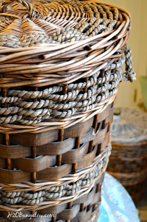 I know I can always find something that has potential if I look hard enough. I rummaged through closets, boxes, the garage and did a walk-by of all my rooms. These baskets are like my vertical blind dilemma, functional but not pretty, and were begging for an update!