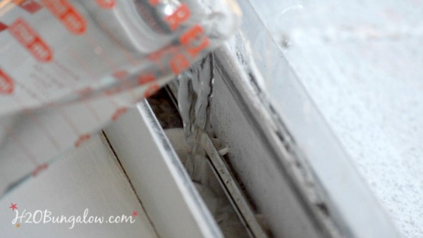 Step 3. Sprinkle some baking soda into the tracks and follow it up with white vinegar. The video shares how much to use and shows how the fizzing action helps to dislodge the stubborn dirt in the tracks.