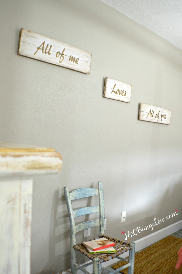 I think my DIY Love Wall Plaques fit well on this big blank wall without adding bulk or breaking up the wall. They also keep the eye traveling inward which helps the room look larger.