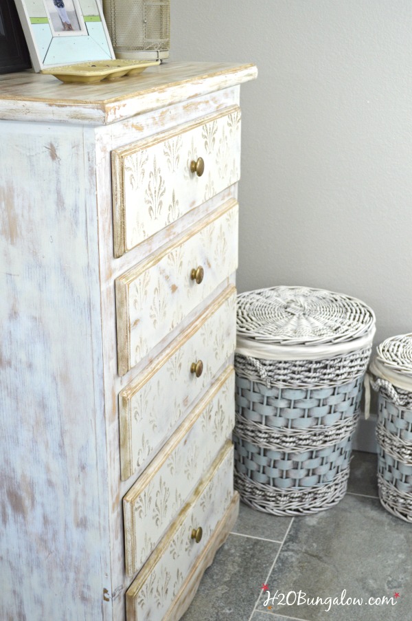 The white painted baskets next to my painted chair and dresser changed the corner from dark to bright and cheery. Remember this dresser from the original before pictures? I love the antique gold damask pattern.