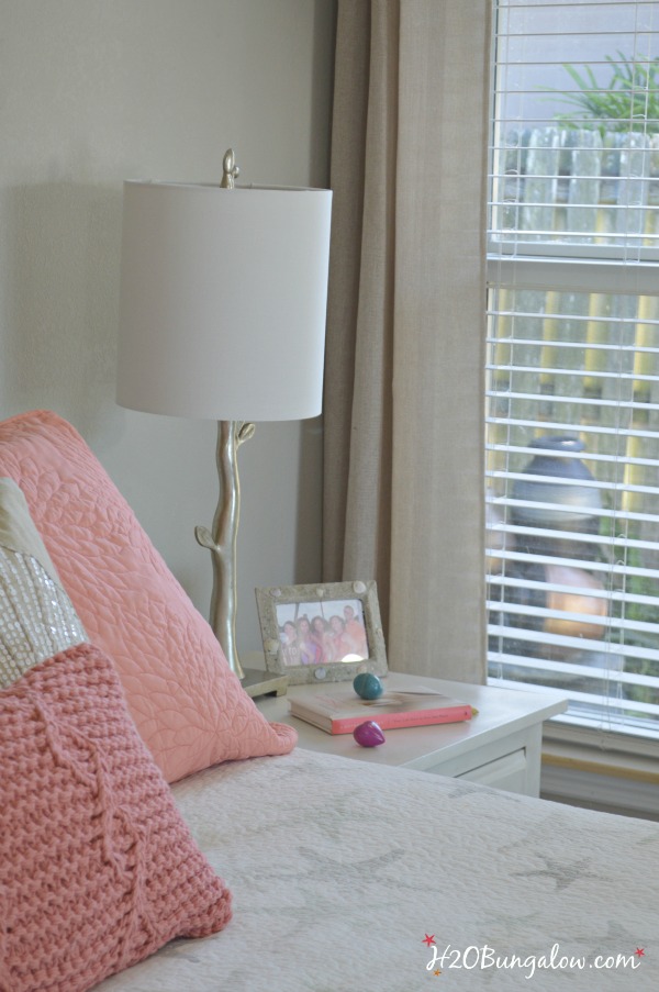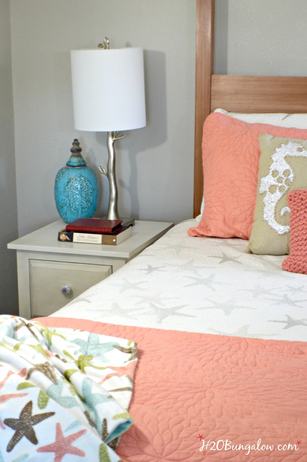 Love the pop of coral you added Wendi and I’m swooning over the pretty seashell and seahorse pillows. You put a heck of a lot of DIY hours into this room and injected your love of the beach in every corner. Well done my friend!