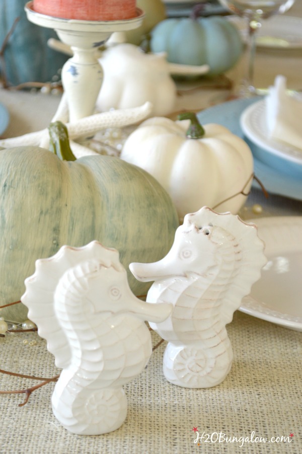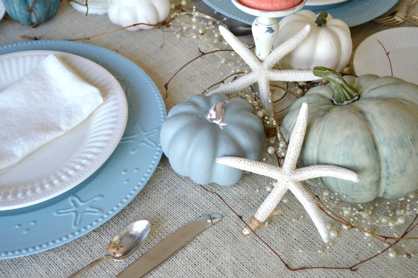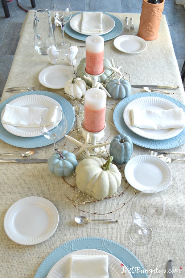 Take away the pumpkins and this coastal holiday tablescape looks great for for a nice dinner with friends or family any time of the year.