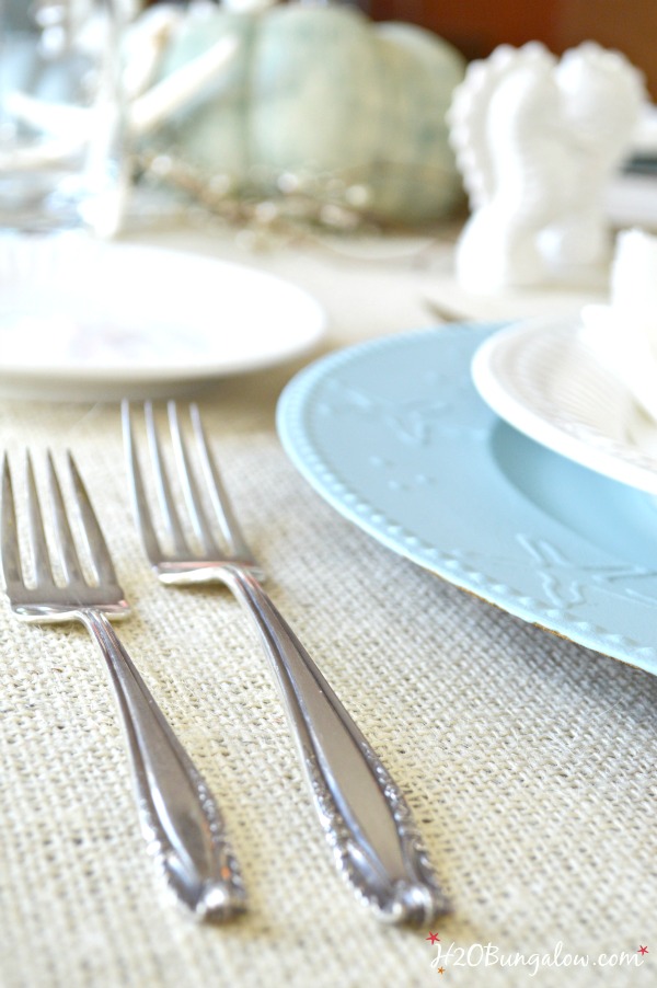 Your coastal themed Thanksgiving table is perfect for your area of the country. I love the colors that you used and how great they look with the burlap table cloth.