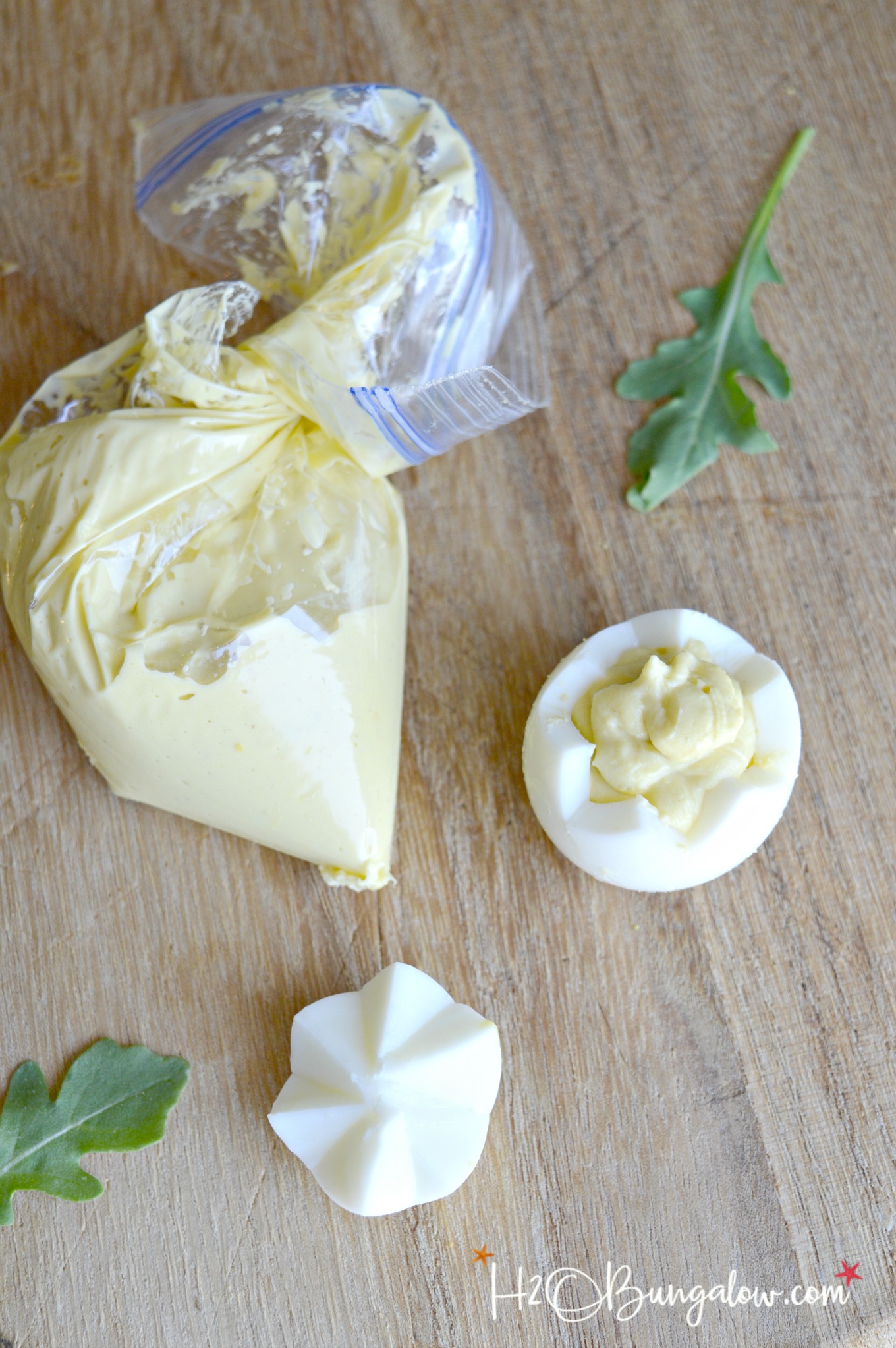Step one: Peel cooled hard boiled eggs. Cut a slice off of the bottom wider end so they’ll stand upright. Use a small knife and cut around the top in a zig-zag pattern. Be sure to cut the eggs low enough so there’s a good size opening to get the yolk out.