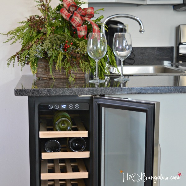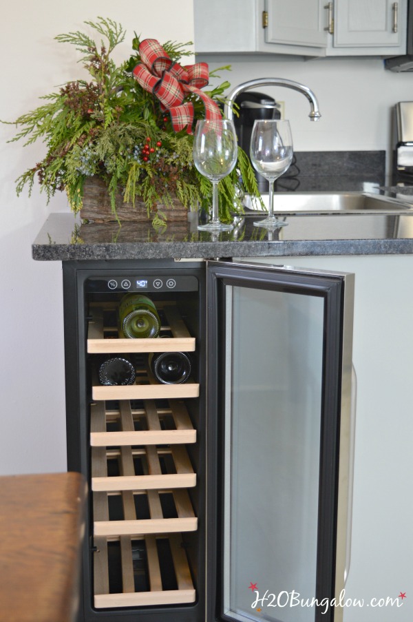When the granite company came to measure for the new granite countertops I had them add enough overhang to be sure the wine refrigerator fit perfectly underneath with enough extra counter on the side to match the rest of the counter overhang in the kitchen. At only 12 inches wide, 23 inches deep and 34″ tall this wine cooler fits perfectly under the counter.