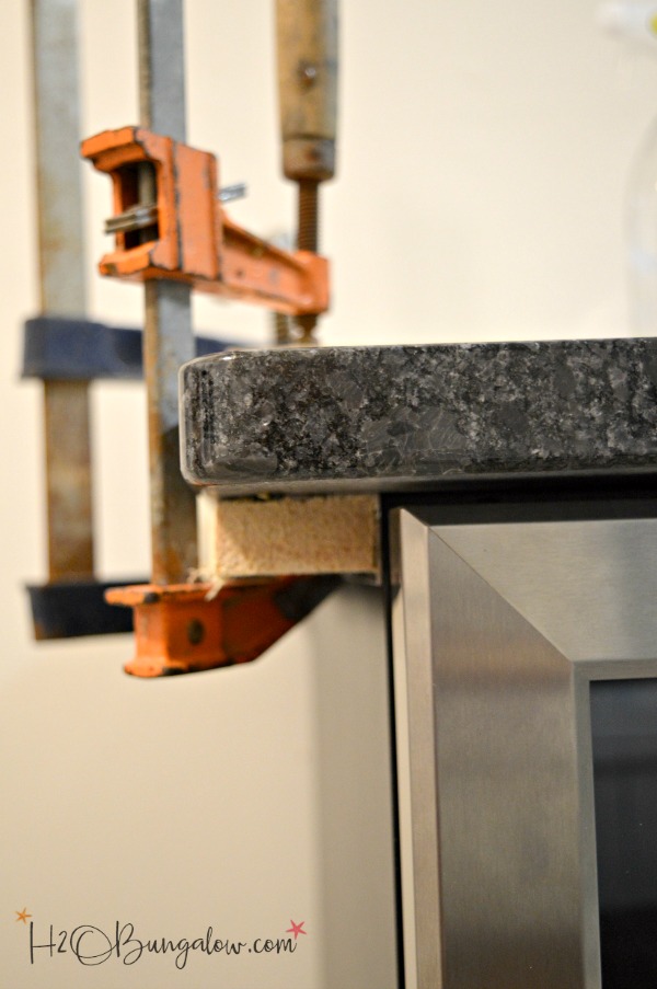 To make the DIY built in wine cooler stable and not slide out of place as people open and shut the door, we braced the underside of the granite. We attached a piece of right angle aluminum with silicone. You can find this at a hardware store and easily cut it with a hacksaw or jigsaw. Clamps were used to hold it in place for 24 hours to dry. Note that we used scrap wood to protect the granite on top and to help get good pressure on the metal piece underneath the granite while it was clamped.