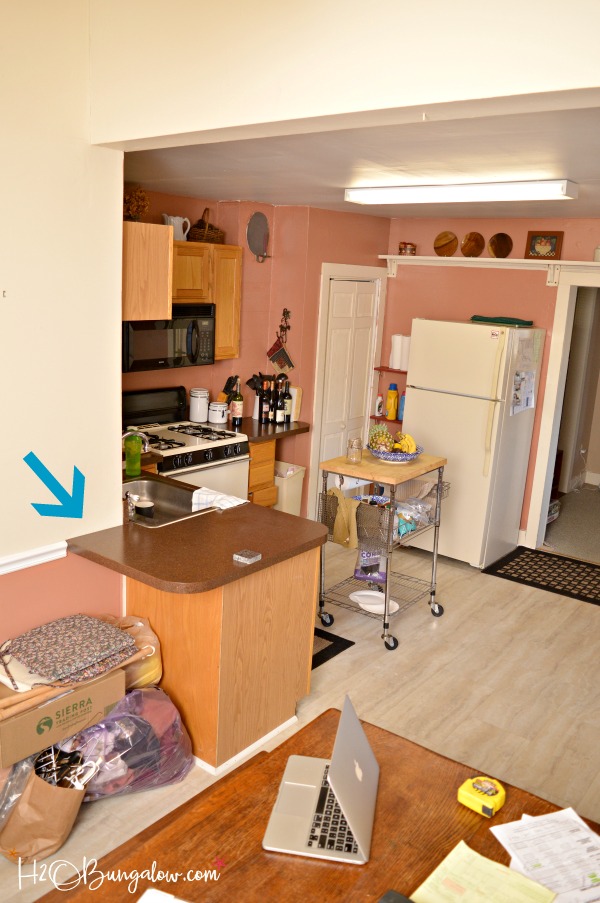 I picked a spot that was out of the way and had access to an electrical outlet. There was already an overhang of counter where a few stools were placed. This is what the kitchen looked like when I first arrived in early November. The blue arrow points to the spot where I planned to put my new built in wine cooler.