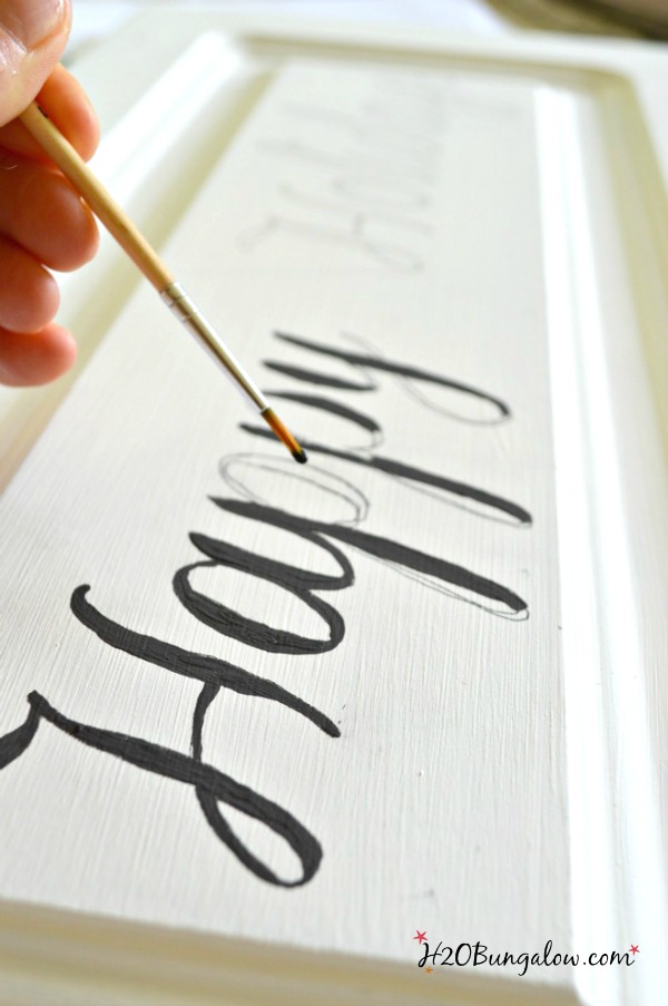 Cabinet door signs are a breeze to make. Clean with a little TSP (trisodium phosphate) or Simple Green cleaner. I like to rough up the surface just a tad with sandpaper before painting.