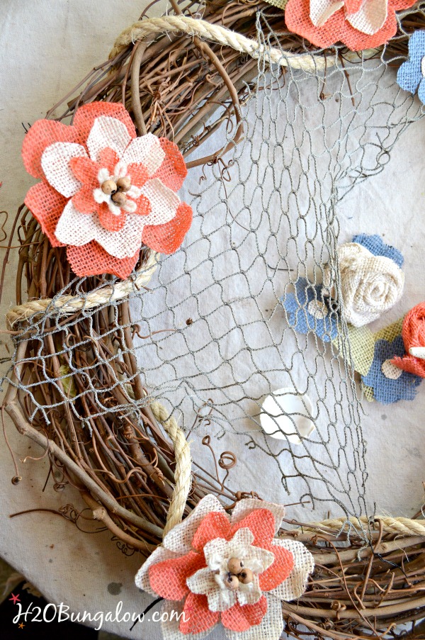 I love how this wreath turned out! The burlap flowers with the fishnet are just perfect!!