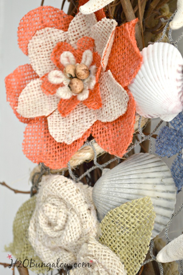 Then I kept adding the rest of the burlap flower rosettes and the burlap daisies I made until I liked the way my new burlap flowered coastal spring wreath looked.