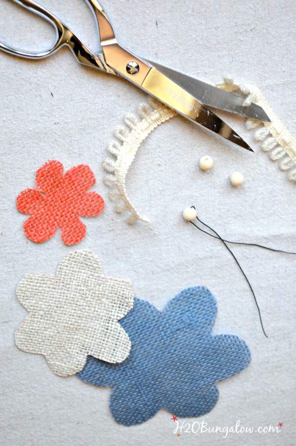 I made blue small daisy burlap flowers from just one flower cut out and a small circle of burlap in the center. I also made burlap rosettes. My sweet friend from Confessions of a Serial DIYer made this good video if you don’t know how to make rosette burlap flowers.