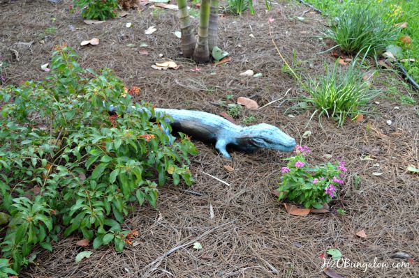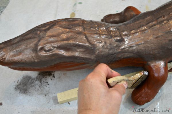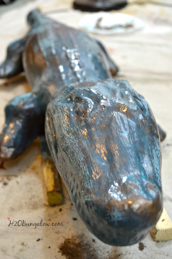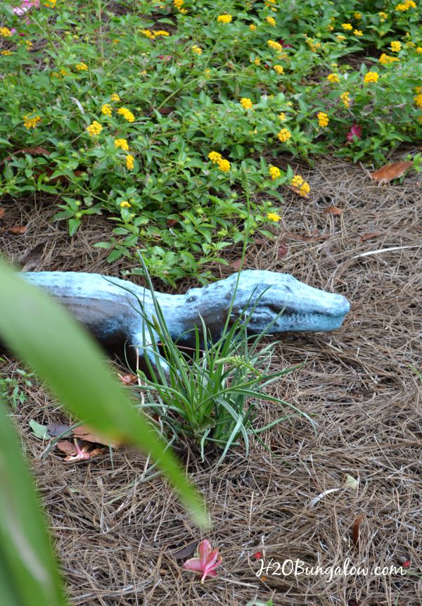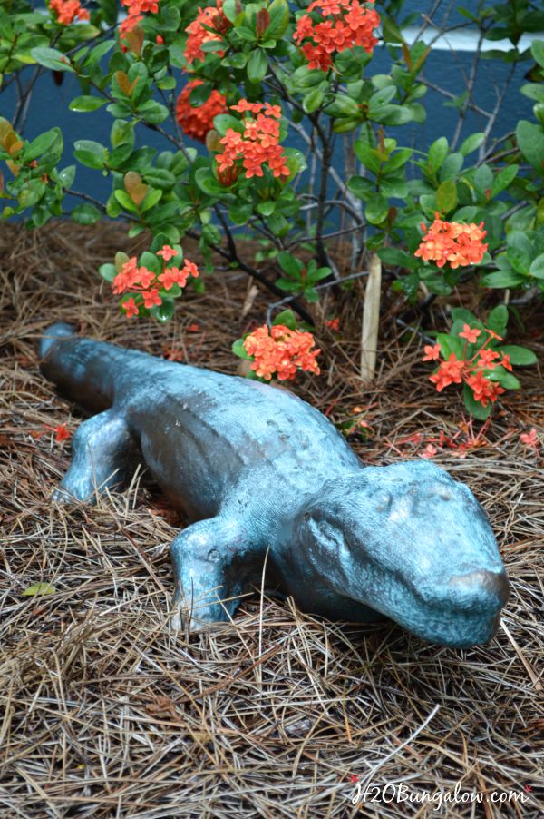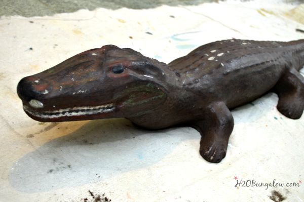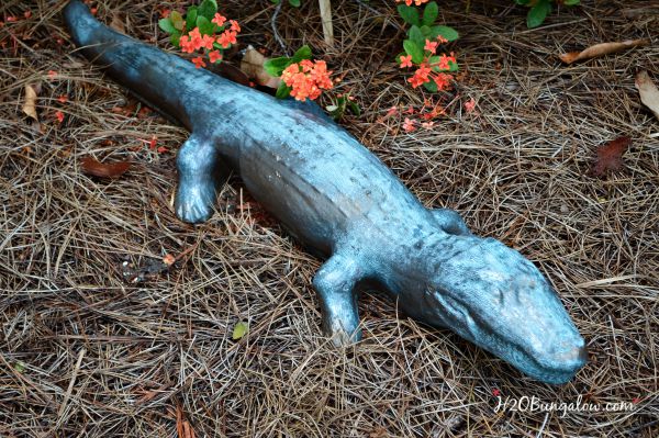 We found a large concrete dog with a broken ear, two concrete lions, a bicycle pack, a mirror, lots of beer bottles, several large conch shells and an alligator with a broken tail. All of these were under and inside the massive bush that covered my front yard when we moved in. As pitiful as it was, I kept the alligator. I liked it. My little concrete alligator has been in our front yard for the last 3 years. In his original worn out state. This morning I turned him into a DIY faux bronze garden statue and now he looks like I paid big bucks for a bronze statue!
