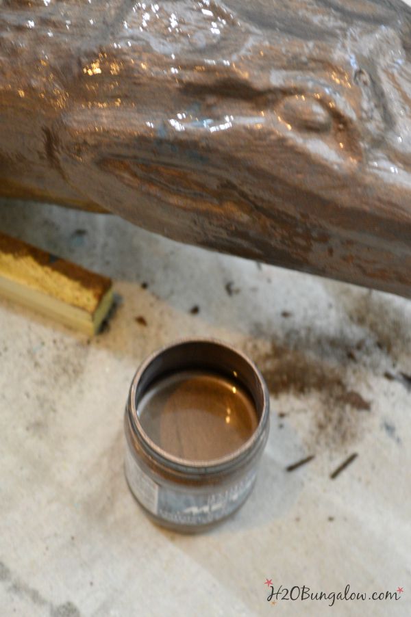 While the second coat of paint is still wet, mist all over with the spray top attached to the Patina Aging Solution. You could spray a lot lighter than I did. I wanted a heavily oxidized patina. No worries if you don’t like it, you can always paint on another coat of the bronze and re-spray the aging solution.