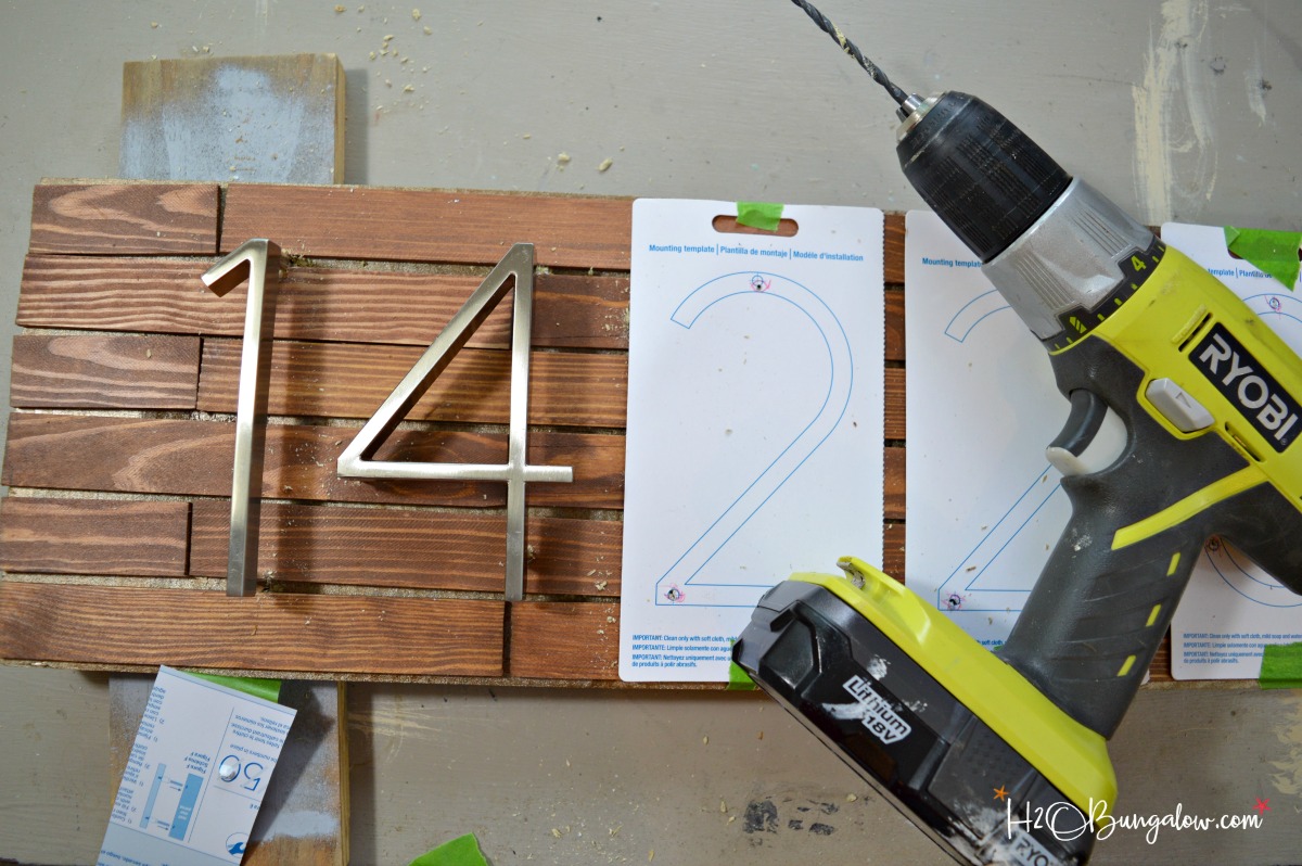 Address numbers can be attached directly onto the plaque with the adhesive or mounting tape. My numbers are floating with mounting pegs and came with templates for drilling. If your numbers come with templates check every one and correct the errors by marking where to drill with a colored pen. Don’t assume duplicate numbers will position the same on the templates either. Most of my templates were way off which would have ruined my project! See the #2 below?