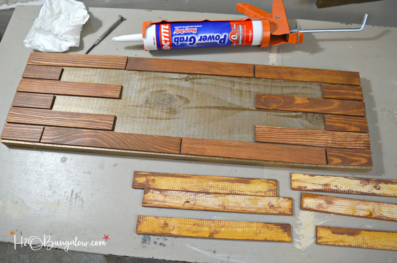 Use construction adhesive, position and glue wood slats to the base. Spacing the wood slats is easier if you position them from the outside in. Allow the glue to dry.