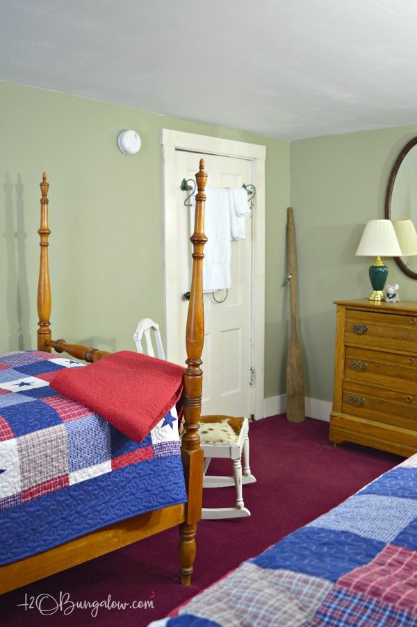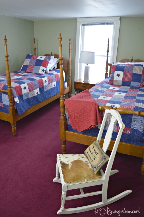 The second floor in the North House has two bedrooms, this chair sits in what will be the Americana Room. I’m giving each room a theme to make it fun for guests. If you’re just now tuning in or catching up and aren’t familiar with my newest DIY adventure, you can read about the North House Lodge here. I should mention the lodge came furnished, which is great. The challenge is deciding where to start making over or refurbishing everything since I’ll only get a few months a year in VT to work on the many projects I want to do.