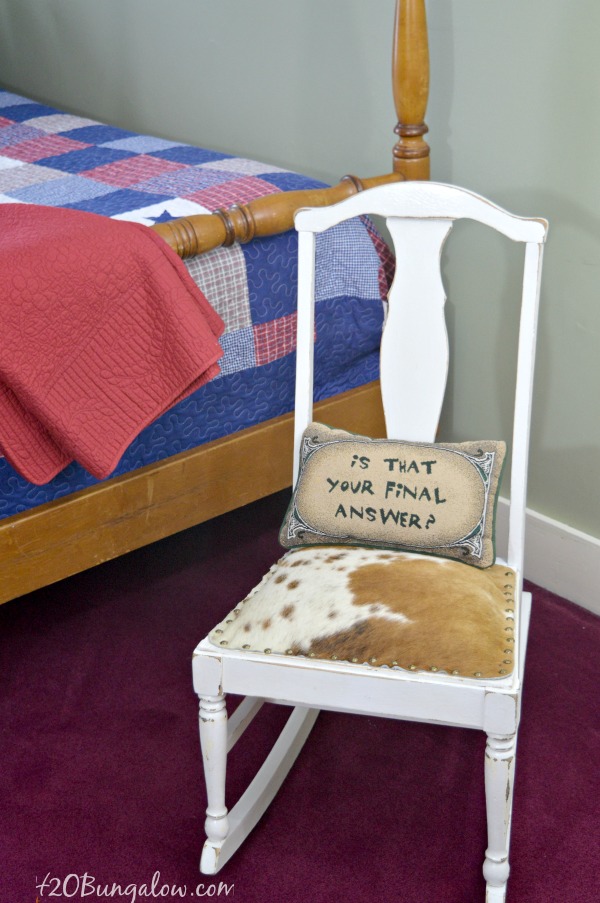 Like I mentioned earlier, I made up the idea on the fly as I was cleaning out the closet it struck me that a cowhide seat would look great on it and with the theme of the room.