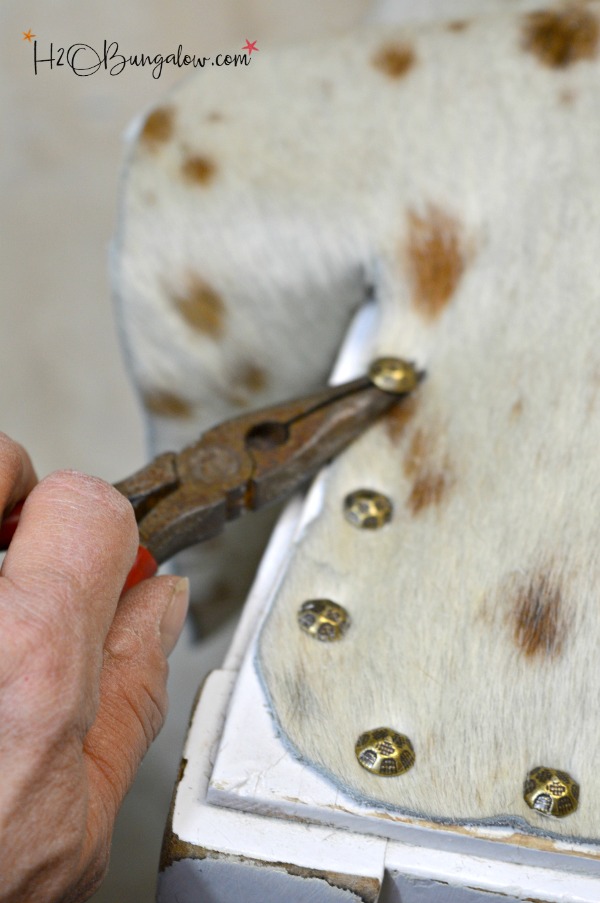 The next big tip I have to share is to cut the hide to the shape of your seat on 2 sides only. Leave an area that can be trimmed on the other two and trim the excess off as you go along. It’s much easier to cut the hide too big and trim the edges as you work! I’d recommend cutting the front side and starting the nailhead trim there first, working your way around the sides and to the back. You’ll have the best control on the front and want that to look the best since it’s what is seen first. On my nailhead trimmed cowhide seat the front was the third side I tacked down but that was because I hadn’t figured this out yet 🙂