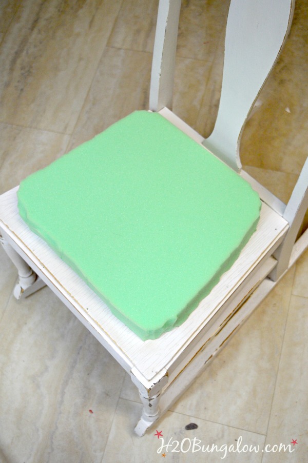 I cut the foam to fit the chair seat with a margin of seat exposed around the edges. Use a little spray adhesive to secure it to the chair seat once it’s trimmed. You’ll notice I cut and angled the edges down a bit as well which you can see in the picture of the foam below. Keep in mind I’m showing you what worked and not what didn’t work. There was a bit of trial and error with my DIY cowhide nailhead trimmed cowhide seat project 🙂 The good news is that you can skip all the “error” part and move on to getting your own project done and a lot faster than I did!