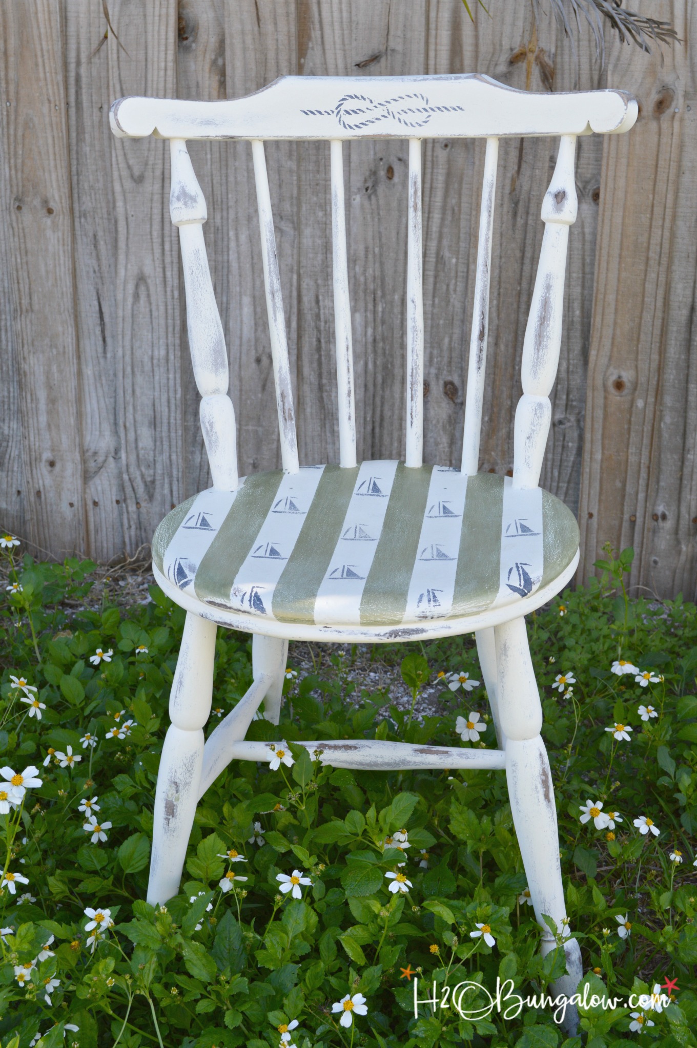 Most of the chair was distressed with wet sanding. which is just using a damp rag to rub off some paint. I didn’t want to blur the stenciled sailboats so I distressed the seat with a fine sandpaper on the chair stripes and sailboats.