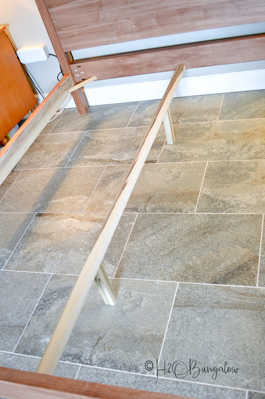 If you choose to add these extra supports too, you’ll need to shorten the side rail cleats a tad. This step is not in the plans, I added it after I had them made. Cut a 45 degree angle on the struts and attach with 1 1/4″ pocket screws. Use 1 1/4″ pocket screws for the cleats as well.