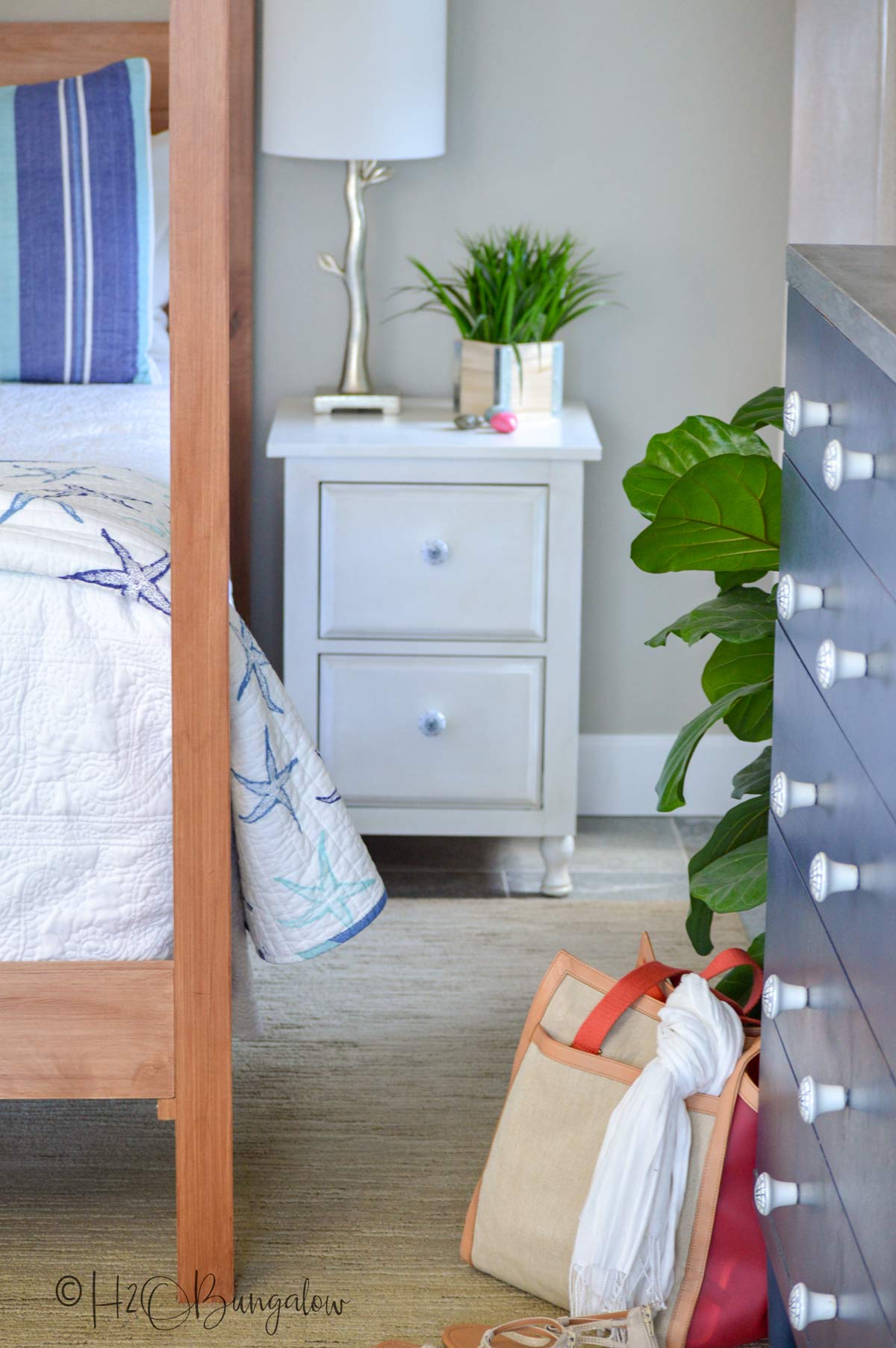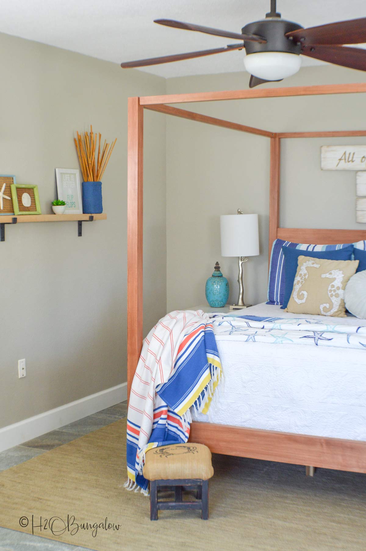 I love the simplicity of my homemade bed frame and the clean lines. It works beautifully with our decor style of modern coastal.