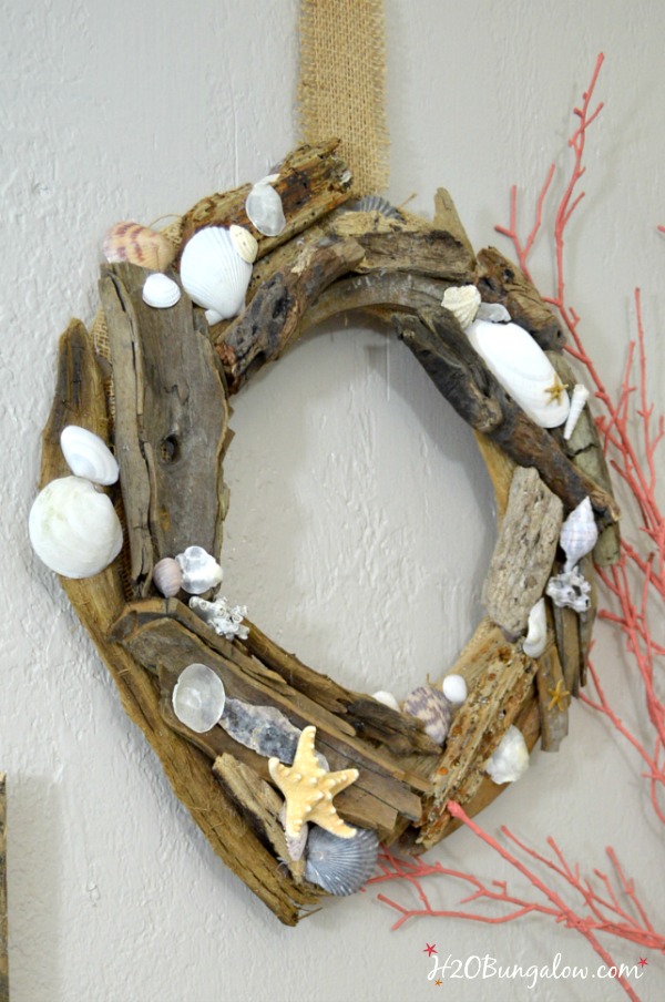 I’m fixing that today with this DIY seashell and driftwood wreath.