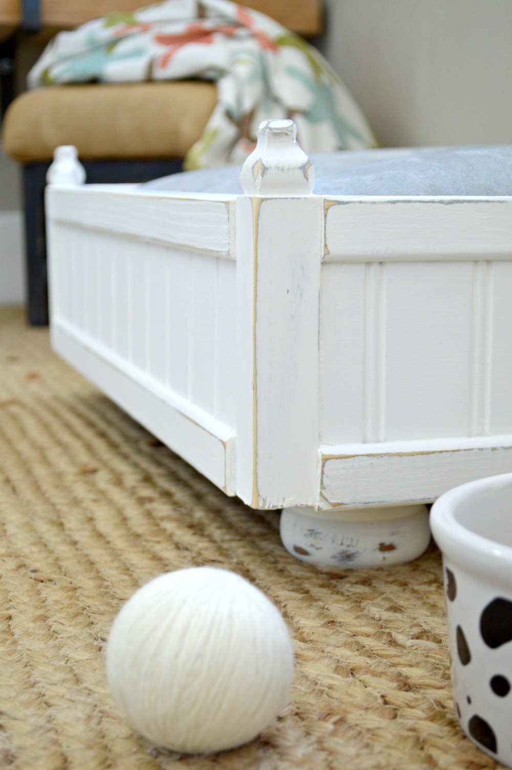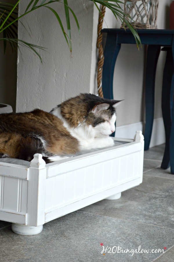 Don’t you love how the spindle feet turned out on Sam’s bed? They’re perfect for this coastal style cat bed.
