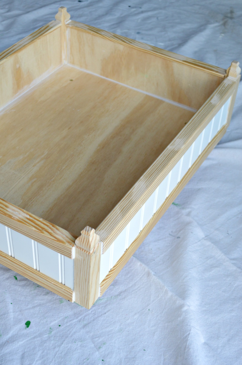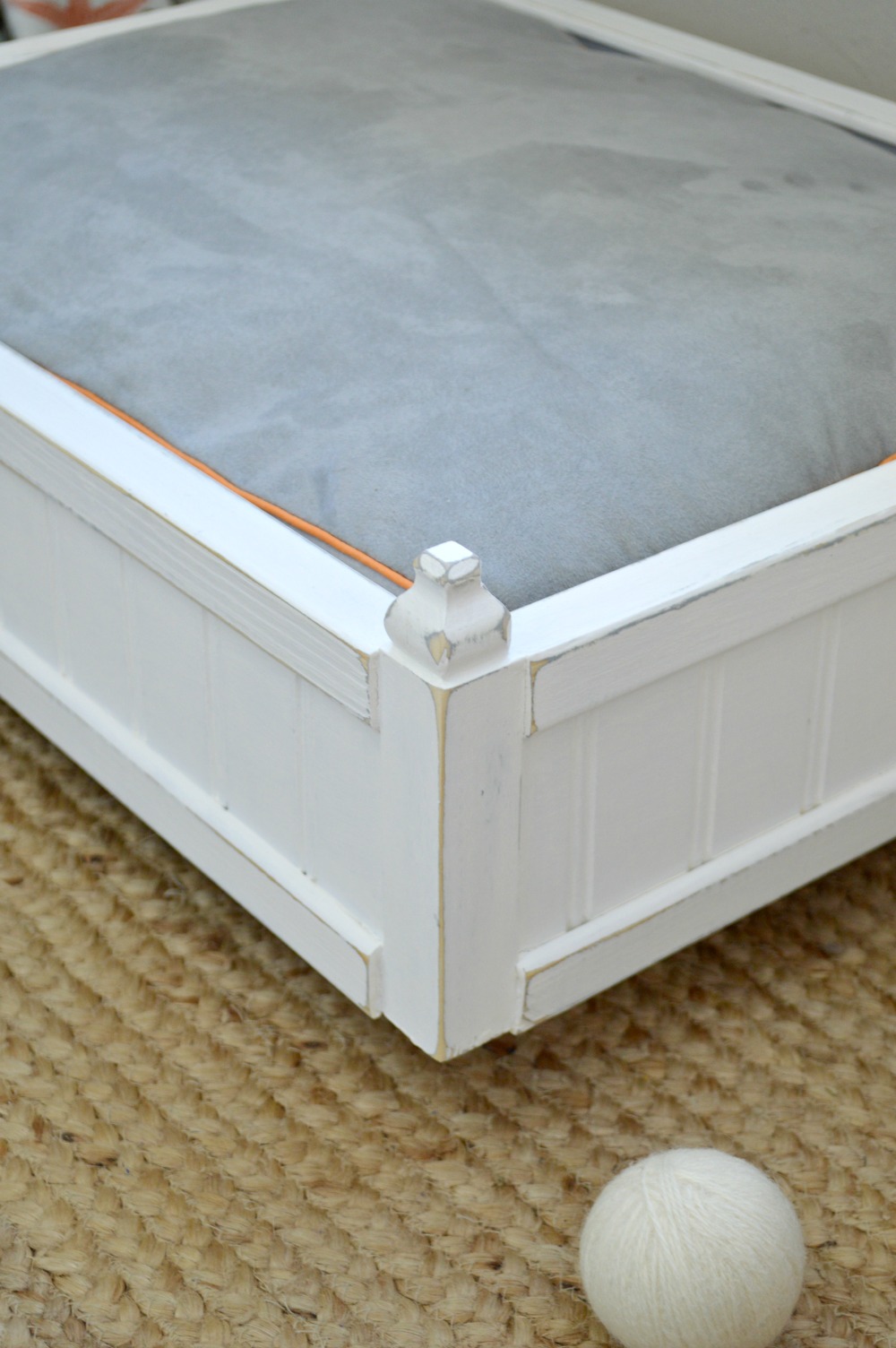 I wanted a quality finish that looked like a piece of furniture for my DIY pet bed. One that would fit a coastal or farmhouse style home. I started by giving everything a coat of grey paint all over and followed that up with a coat of white only on the outside.
