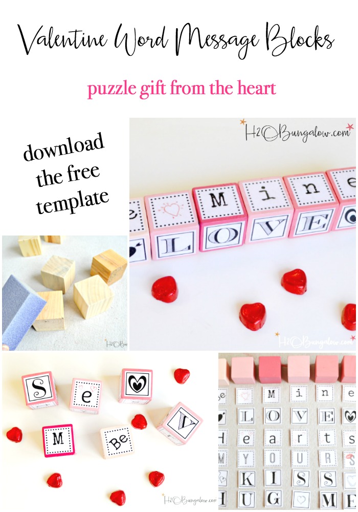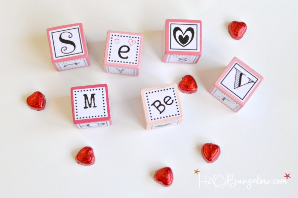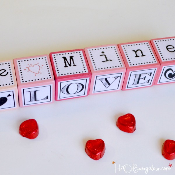 Valentines Day is just around the corner. For me personally, I’d rather have a meaningful token as a gift from someone who took a little time to make or put together something from the heart. I guess that’s why I like these DIY Valentine Word Message Blocks with Be Mine, I’m Yours, Kiss Me and a few more fun words on them. I’ve made it easy for you to do this project by sharing the letter template I made. All you need to do is download, print and glue them onto blocks. Easy!