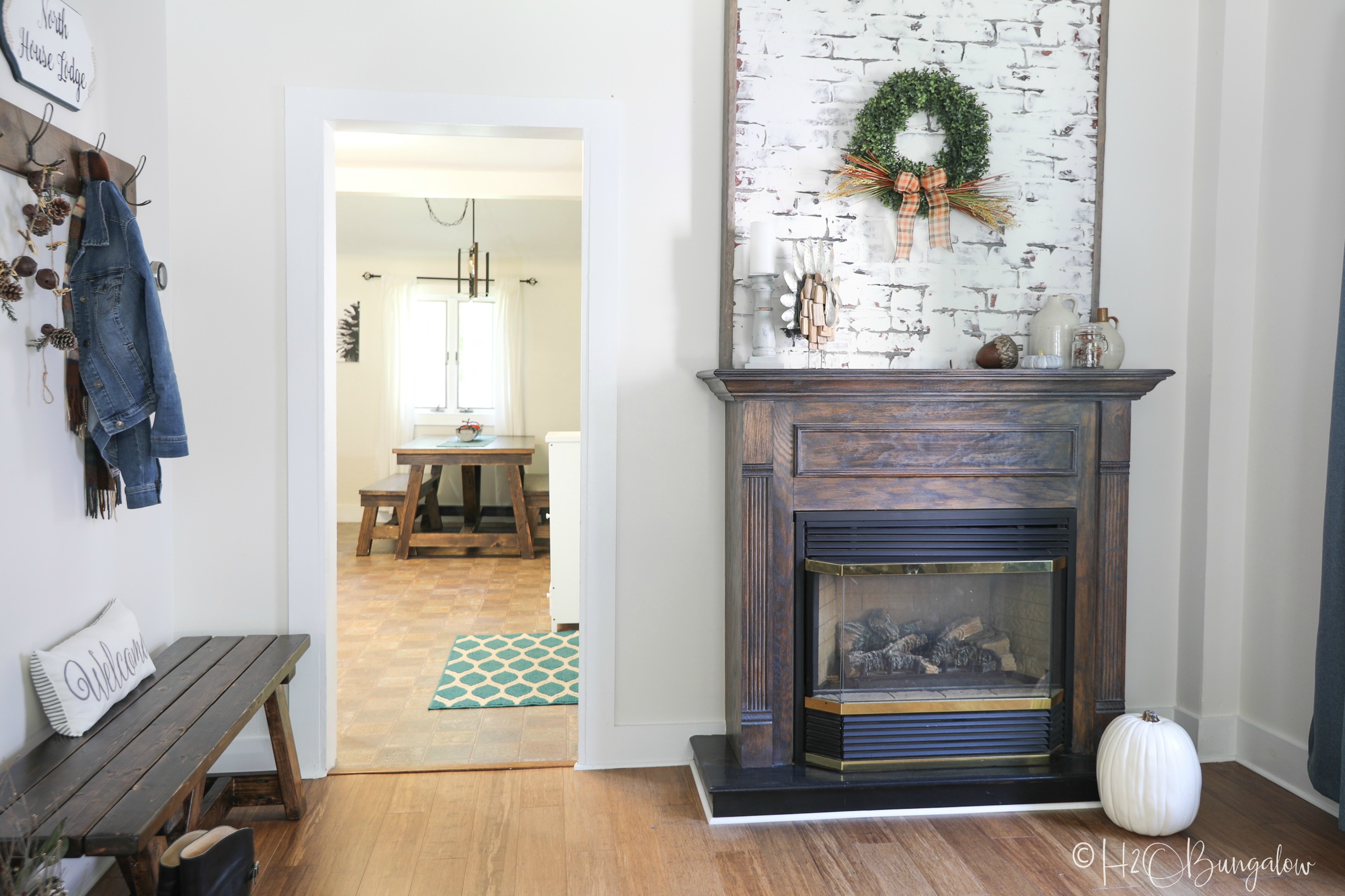 I really the the wreath and fireplace. Looks very homey.