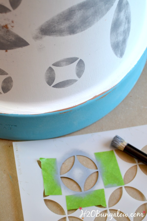 Stencil geometric patterns or use parts of a stencil to make complimentary shapes on the three terra cotta pot bases. Here’s a neat trick for stenciling, if you want to use just one area of a stencil, tape off the area around it to prevent paint going into areas you don’t want them to go.