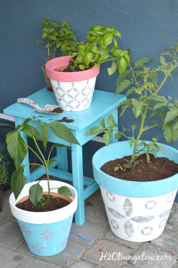 Let your new painted pots for your container garden sit for a day or so to let the paint cure, then fill with your favorite flowers, herbs or or veggies.