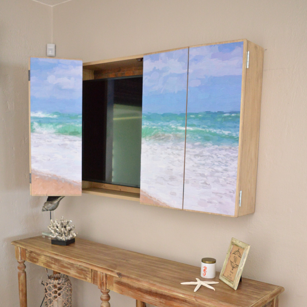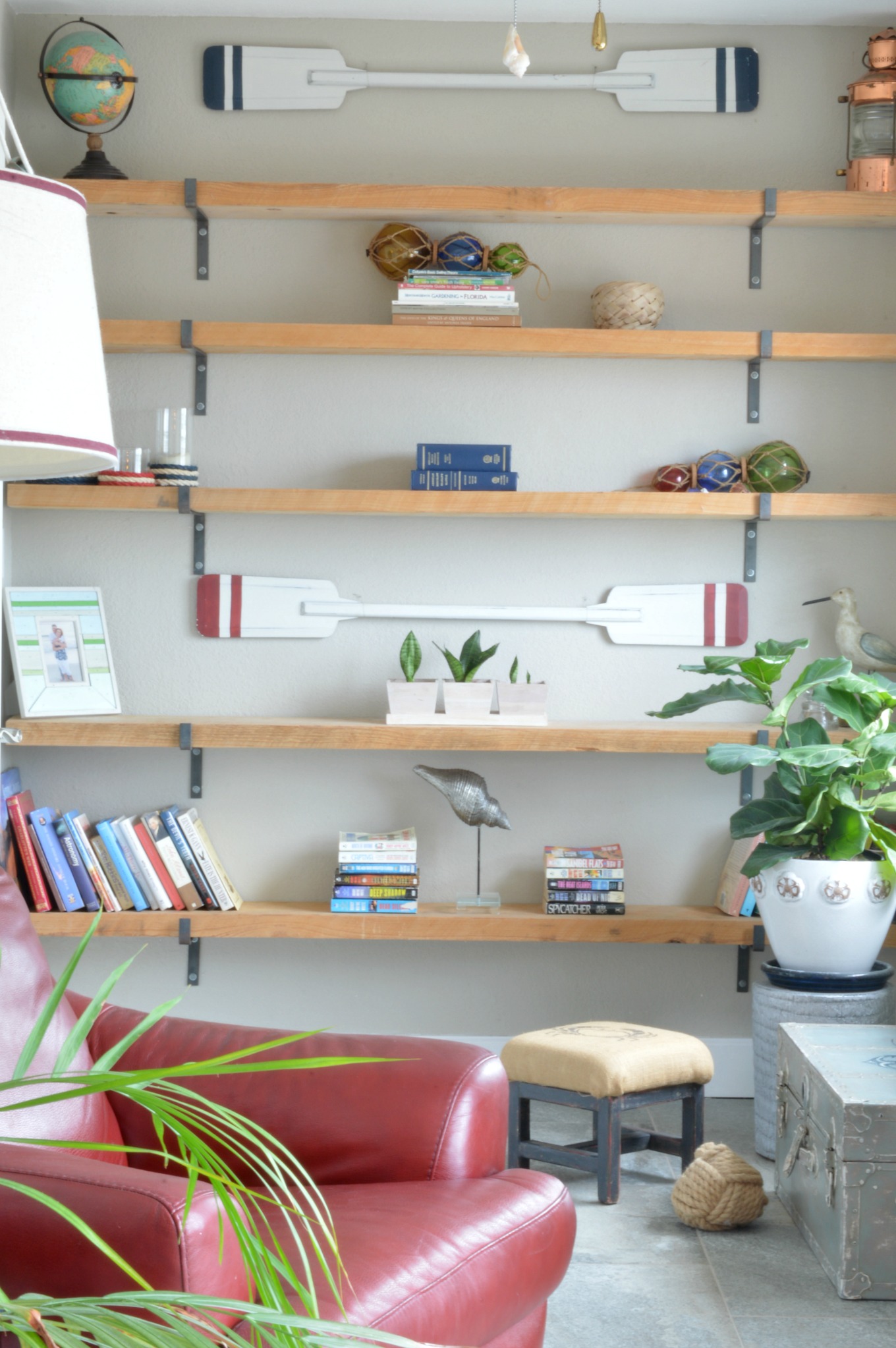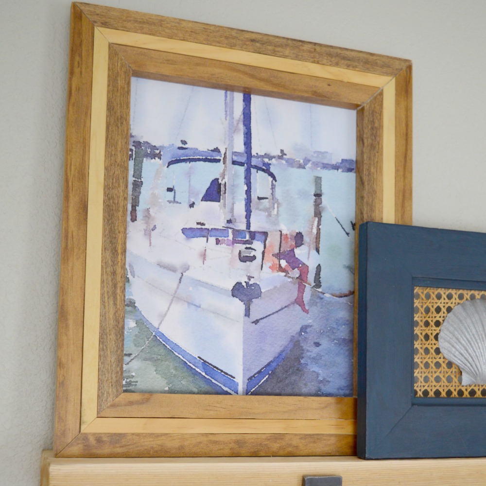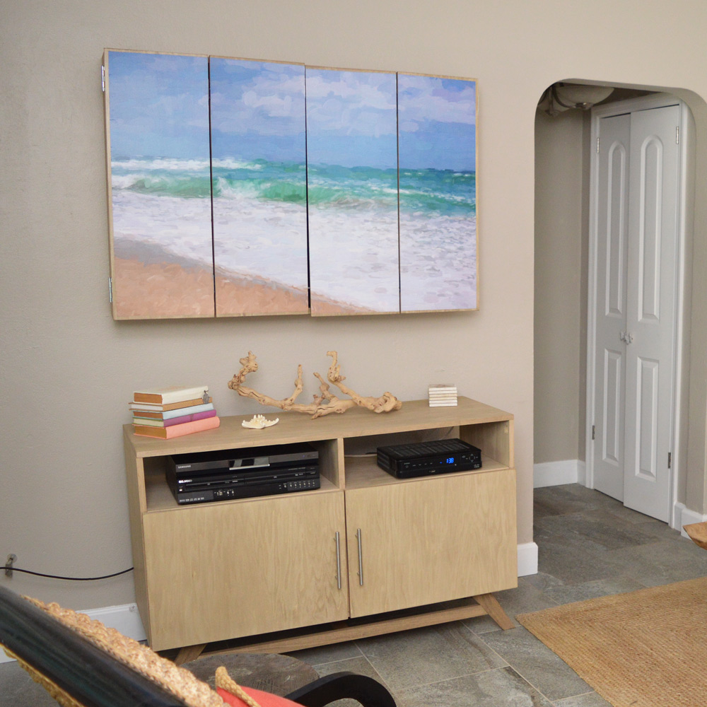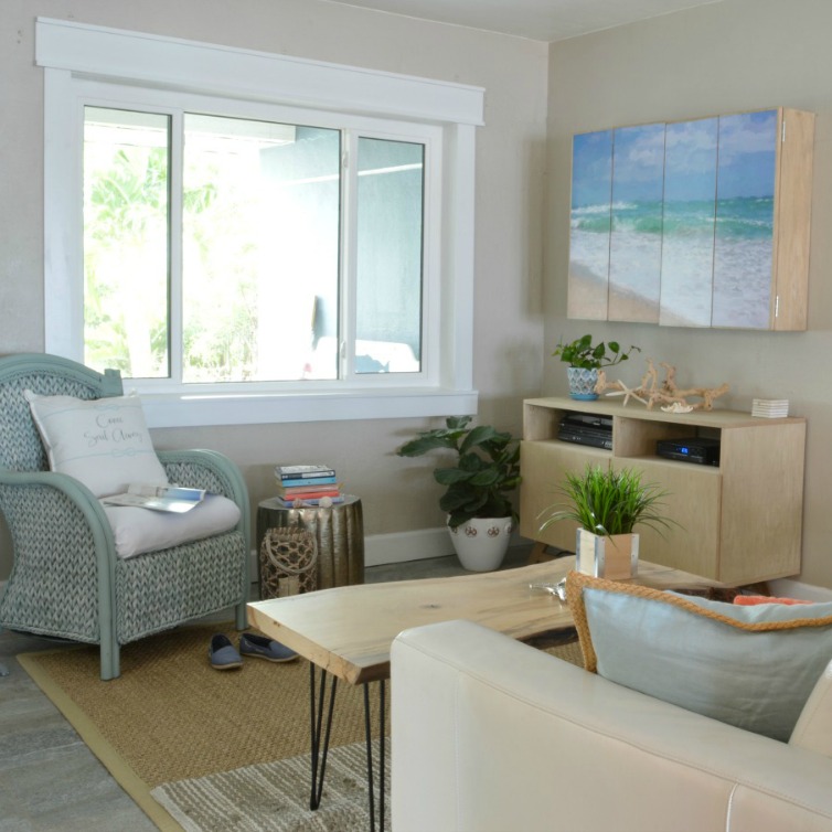 DIY Craftsman Window Trim ⌑ The Media Console I built ⌑ Wall Hanging TV Cabinet ⌑ DIY Live Edge Coffee Table ⌑ Painted Wicker Chair ⌑ Stenciled Sail Away Pillow