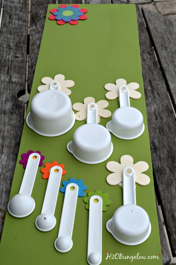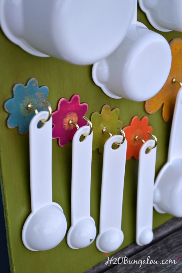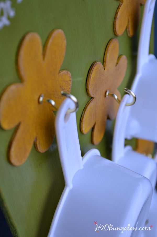 Lay out your measuring cups and spoons first. I had to be creative because my cabinet was so narrow. The plywood is lightweight which is good. It’s also thin, so I used wood applique flowers that I found at Michaels to add a little bit of thickness for the cup holder hooks. With the appliques, the hooks only mounted onto my board and didn’t screw into my cabinet.