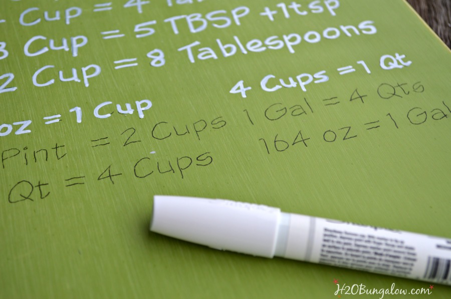 The measuring chart was made in Pic Monkey and saved as a jpeg file. Any word processing or art program will work, just be sure to save the file as a jpeg. Select 8 x 10 size when printing. Trace the letters onto the board with graphite paper and then “paint” with an oil based Sharpie Paint Pen.