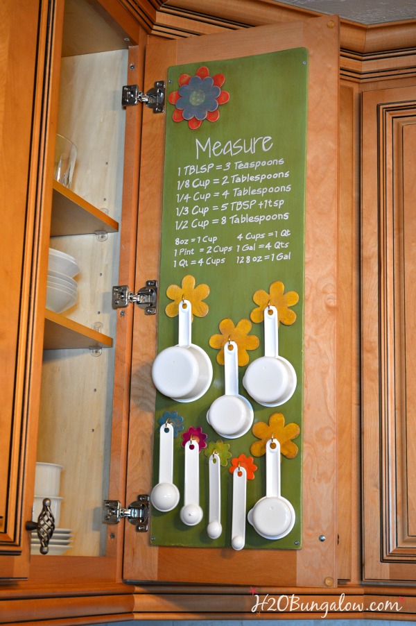 I had some fun with the project I’m sharing today. It’s a kitchen cabinet hanging measuring cup and spoon organizer. It mounts on the inside of our kitchen cabinet door.