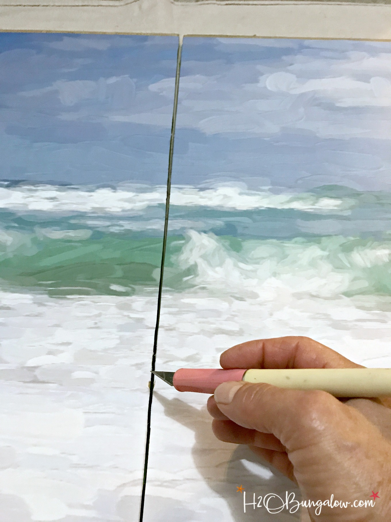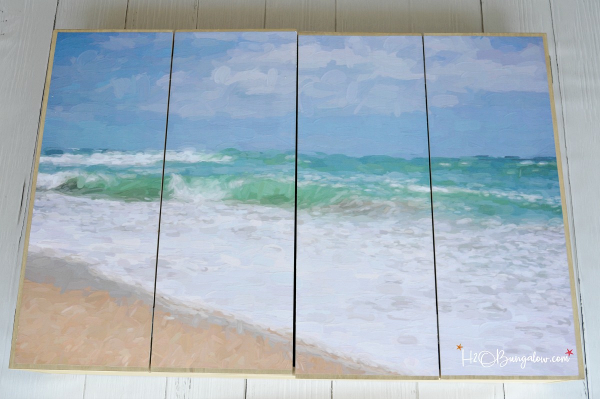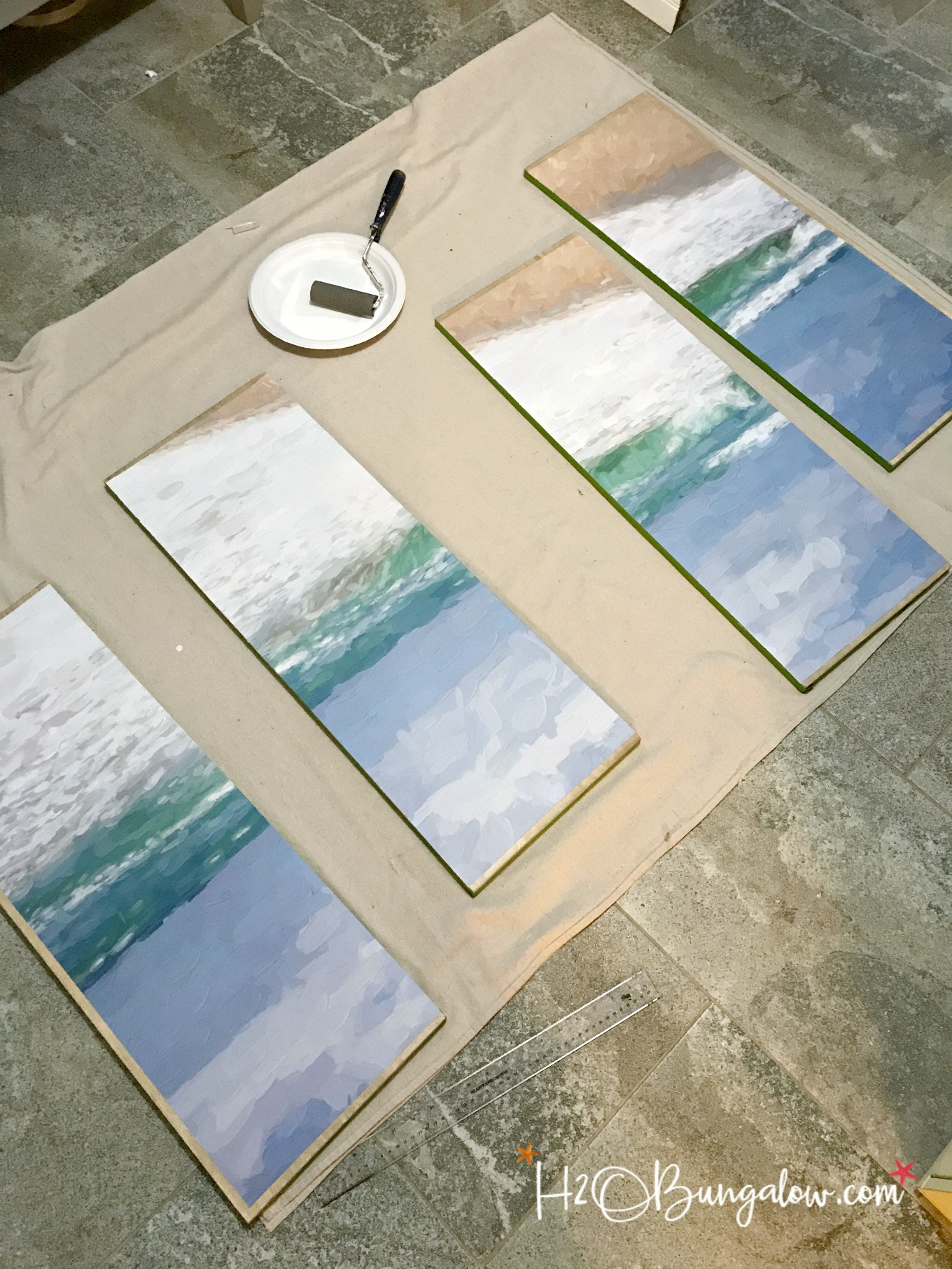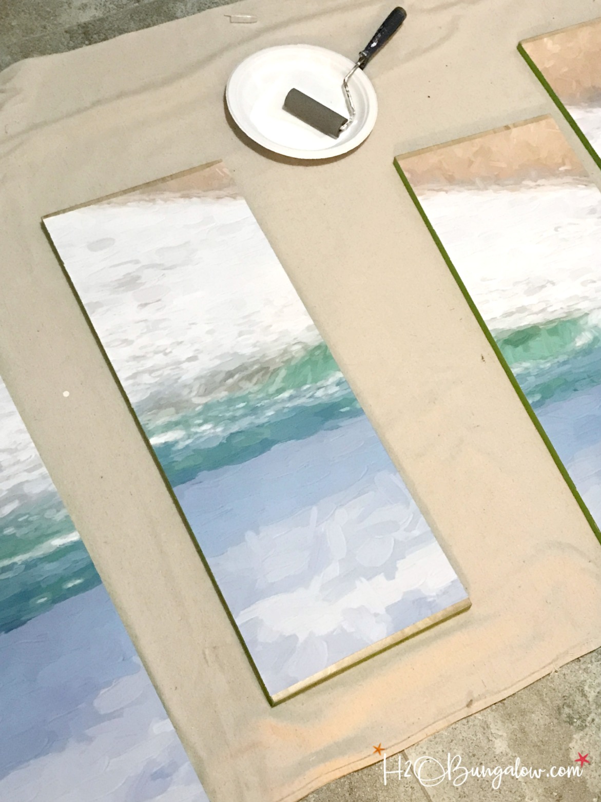 Apply several coats of Decoupage to the engineer print panels, letting each coat dry in between. You can texturize the surface just like I did in my DIY Faux Canvas project. You may see air bubbles pop up on this step, hopefully not, but let them be if you do. They will shrink down and not be very visible when dry. We had some and when the print dried I couldn’t see them at all. Of course when it was wet, I was panicked about my beautiful seascape print not looking good. It turned out fine though.