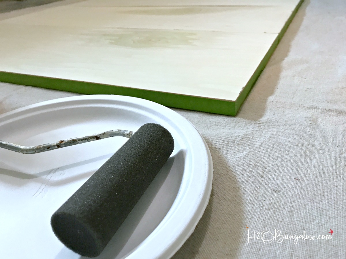 Apply a light coat of spray adhesive or roll on a coat of Decoupage across the entire surface. I prefer the spray adhesive on larger projects. Decoupage works great on smaller ones like my Turn Your Photo into a DIY Faux Canvas Print project which was a lot smaller. Make sure you use enough adhesive so it doesn’t dry while you are working on attaching your poster size print onto your surface.