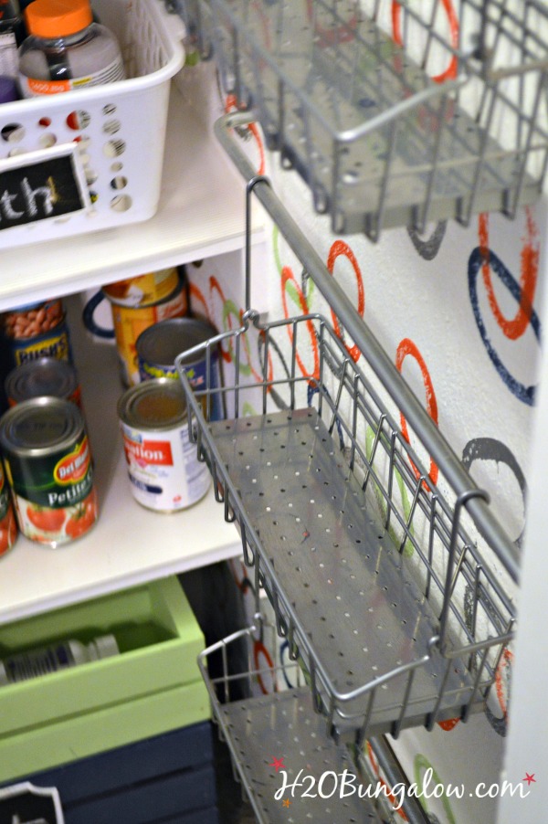 This little hanging cup is from Ikea also. I spray painted a few of these to match the painted wall paper in my pantry. They keep lots of little things organized like spice packets and bag clips.
