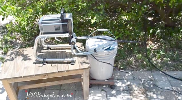 This is the set up I made for the paint and sprayer. You’ll see the paint suction and overflow return tubes run into the five gallon bucket of paint. I set my paint on a plant dolly with wheels to make it easier to move around.