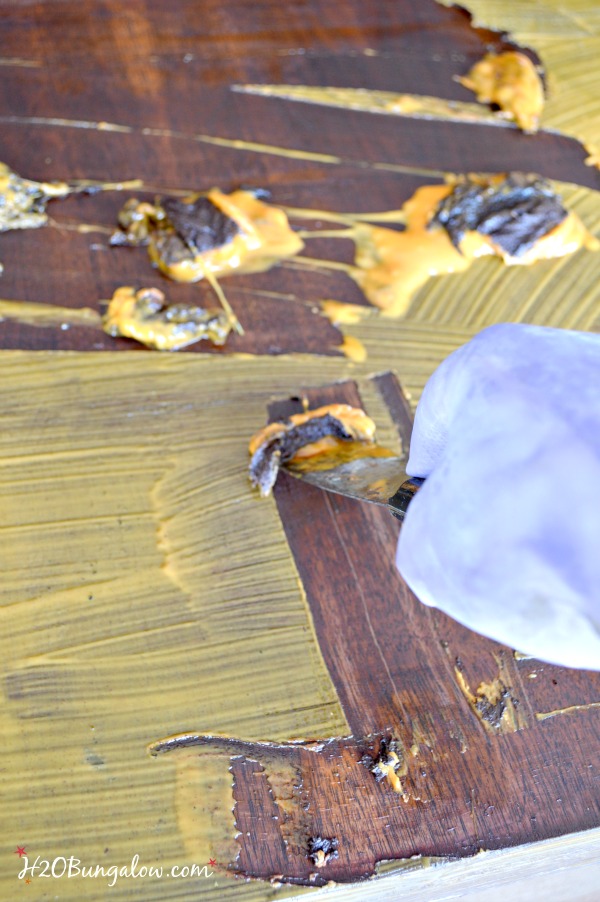 You’ll probably need to use need to use multiple containers of stripper and do several applications in between scrapping old paint off the surface. Wear the heavy duty gloves and absolutely follow my tips in the first post for prepping your area.
