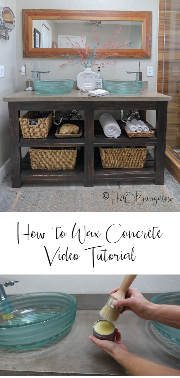 Today I’m sharing how to wax concrete countertops in three simple steps. I built my DIY vanity concrete countertop almost 5 years ago. It’s held up extremely well in spite of me not resealing my concrete counter since I put it in. The old concrete sealer had finally worn off in spots and it was time to reseal the concrete. I’d researched my choices of concrete sealers and choose a non-toxic wax and wanted to share how to apply wax to concrete as well as the reason I choose to wax my concrete counter.