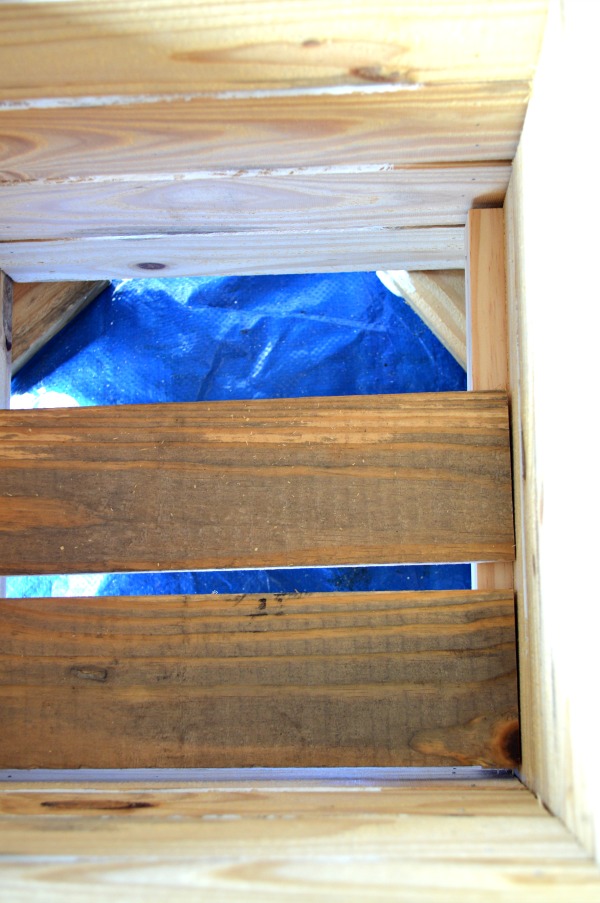 If you’re using untreated wood, make sure you add a plastic liner. I stapled a heavy duty shower liner to the inside.
