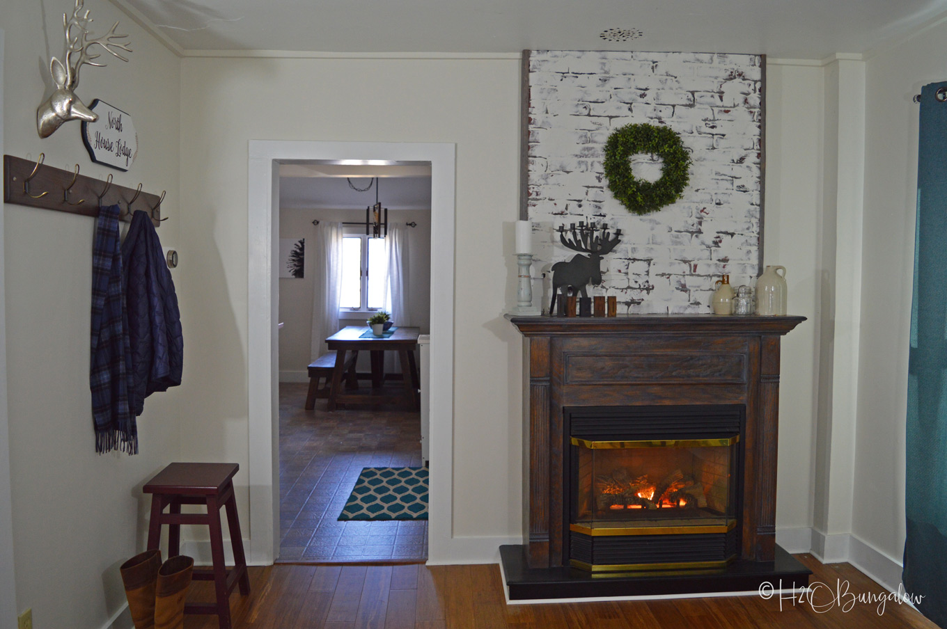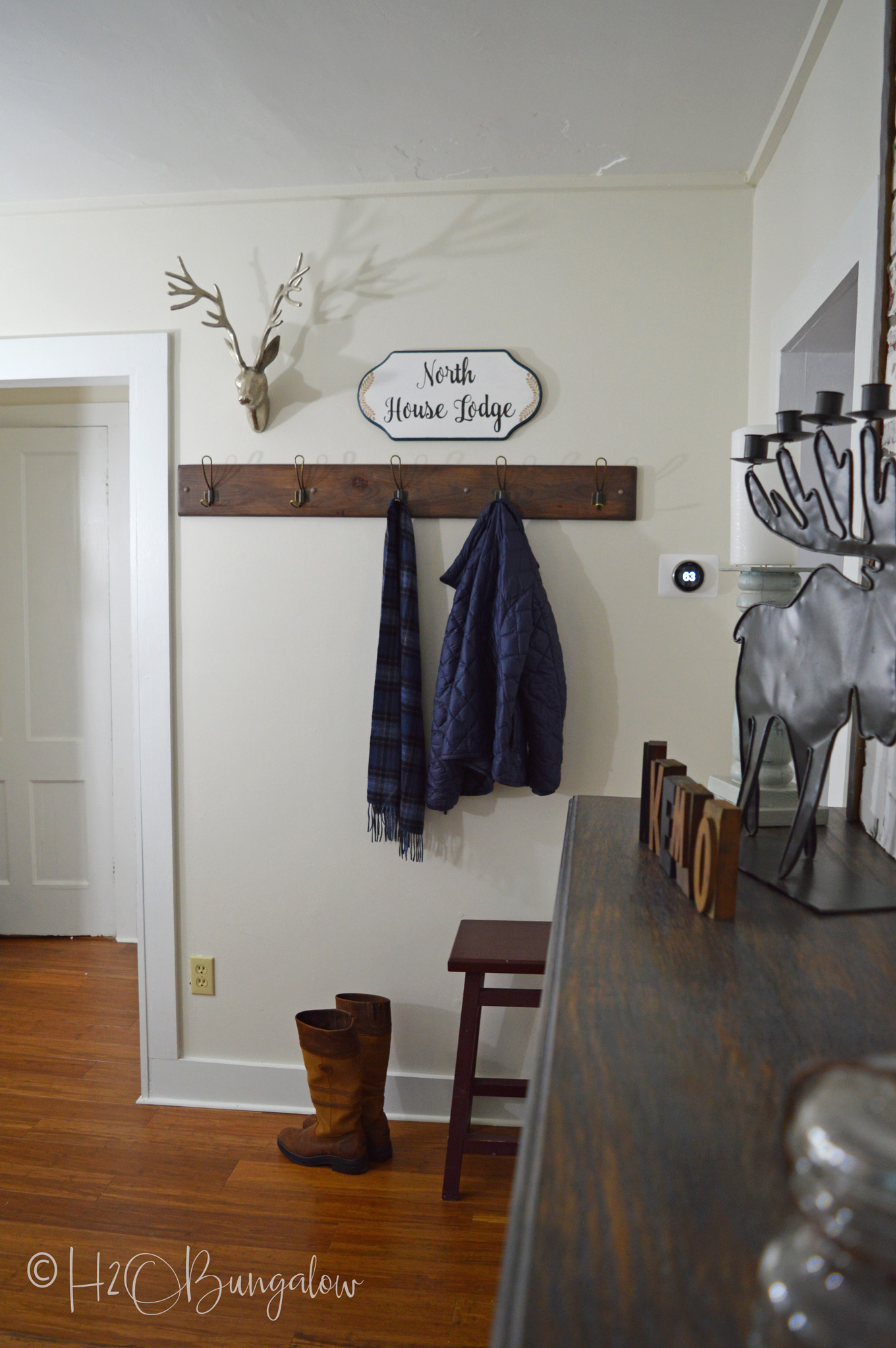 I made a modern rustic DIY vintage hook coat rack for the North House #54 side entry last fall. It was easy to make, basically it was vintage style hooks on a long pine board. What I love about this coat rack is that it would fit perfectly in a modern farmhouse, a rustic modern setting or just about anywhere. Another coat rack that would fit perfectly in a modern rustic setting is this Chevron DIY Coat Rack . Maybe you live at on the coast, or just love the beach and/or whales…if that’s the case, then this DIY coastal whale coat rack or if you’re tight on space, how about this Live Edge Coat Rack, might be more your style. On either, I think my DIY Rustic Garland would look great.
