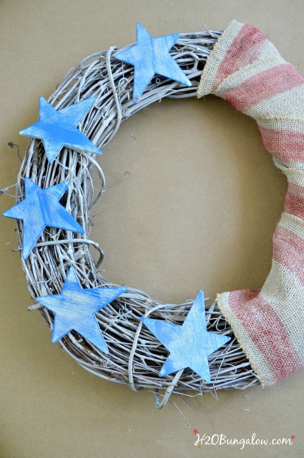 Glue the stars onto the other side with hot glue. Tie the painted sign in the center.