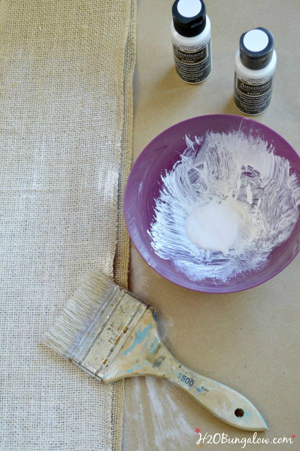 Start by dry brushing a layer of white onto the grapevine wreath, burlap ribbon and the wood plaque with a chip brush. Dry brushing works well when you use an old cheap and raggy chip brush, dab only a little paint on the tip of the bristles, pounce the brush on a paper towel to remove any excess paint and then rub the paint onto the surface. It shades the area instead of an all over coat of paint.